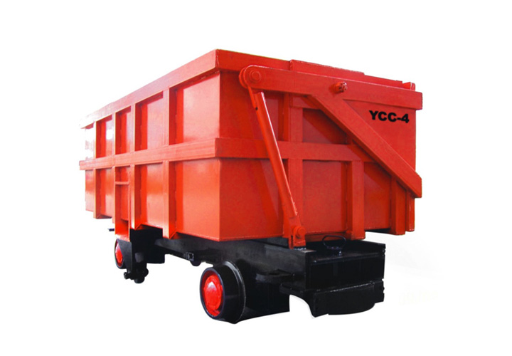 曲轨式侧卸翻斗矿车,是在矿车行进过程中,由卸载轮臂经过卸载曲轨来实现车箱自动倾翻卸料和自动复位。卸矿是在机车牵引下,当卸载轮爬上曲轨时,车箱翻转,车门自动打开实现卸料,车走过曲轨后车箱恢复原位,车门自动锁固。