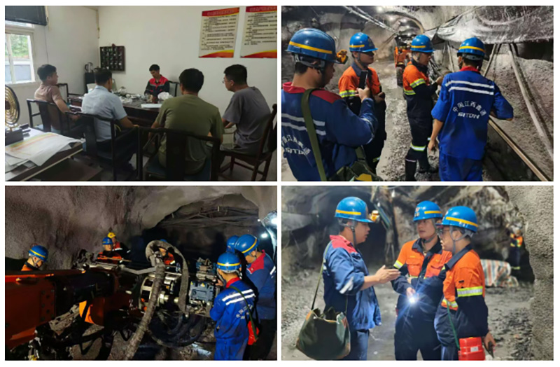 在中国五矿华冶老河坝矿区,团队为14台鑫通设备(5台掘进钻车、4台锚杆钻车、5台扒渣机)提供全面“体检”,与项目部及机电团队深入交流设备运行情况。客户高度认可设备效率与售后工作的专业响应,并针对设备优化设计提出创新建议,以实践智慧反哺产品迭代升级。