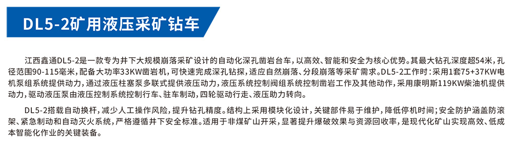 江西鑫通DL5-2是一款专为井下大规模崩落采矿设计的自动化深孔凿岩台车,以高效、智能和安全为核心优势。其最大钻孔深度超54米,孔径范围90-115毫米,配备大功率33KW凿岩机,可快速完成深孔钻探,适应自然崩落、分段崩落等采矿需求。DL5-2工作时:采用1套75+37KW电机泵组系统提供动力,通过液压柱塞泵多联式提供液压动力,液压系统控制阀组系统控制凿岩工作及其他动作,采用康明斯119KW柴油机提供动力,驱动液压泉由液压控制系统控制行车、驻车制动,四轮驱动行走、液压助力转向。DL5-2搭载自动换杆,减少人工操作风险,提升钻孔精度。结构上采用模块化设计,关键部件易于维护,降低停机时间;安全防护涵盖防滚架、紧急制动和自动灭火系统,严格遵循井下安全标准。适用于非煤矿山开采,显著提升爆破效果与资源回收率,是现代化矿山实现高效、低成本智能化作业的关键装备。