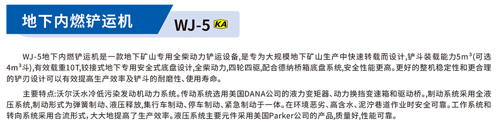 WJ-5地下内燃铲运机是一款地下矿山专用全柴动力铲运设备,是专为大规模地下矿山生产中快速转载而设计,铲斗装载能力5m"(可选4m'斗),有效载重10T,铰接式地下专用安全式底盘设计,全柴动力,四轮四驱,配合德纳桥箱底盘系统,安全性能更高。电好的整机稳定性和史合理的铲刃设计可以有效提高生产效率及铲斗的耐性、使用寿命。主要特点:沃尔沃水冷低污染发动机动力系统。传动系统选用美国DANA公司的液力变矩器、动力换挡变速箱和驱动桥。,制动系统采用全液压系统,制动形式为弹簧制动、液压释放,集行车制动、停车制动、紧急制动于一体,在环境恶、高含水、泥泞巷道作业时安全可靠。工作系统和转向系统采用合流形式,大大地提高了生产效率。液压系统主要元件采用美国Parker公司的产品,质量好,性能可靠。