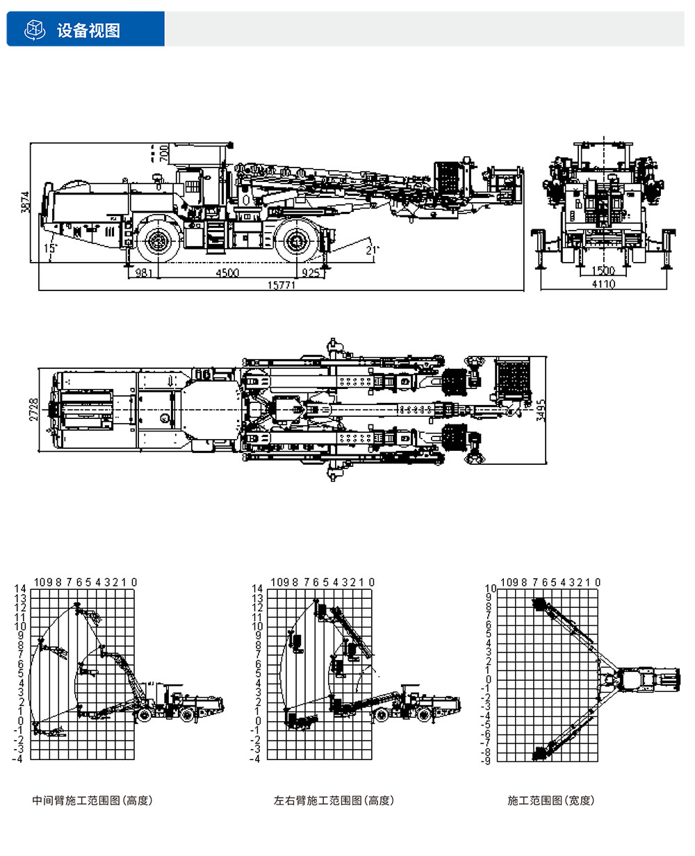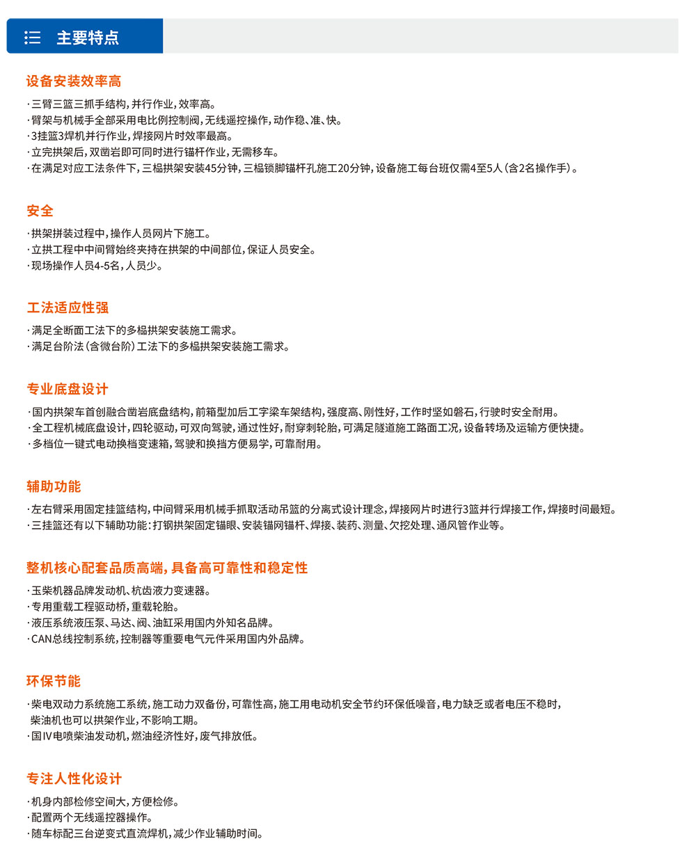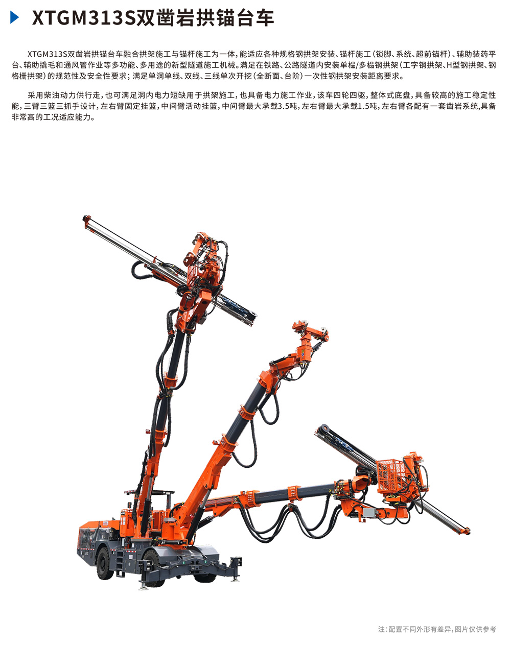 XTGM313S双凿岩拱锚台⻋融合拱架施⼯与锚杆施⼯为⼀体,能适应各种规格钢拱架安装、锚杆施⼯(锁脚、系统、超前锚杆)、辅助装药平台、辅助撬⽑和通⻛管作业等多功能、多⽤途的新型隧道施⼯机械。满⾜在铁路、公路隧道内安装单榀/多榀钢拱架(⼯字钢拱架、H型钢拱架、钢格栅拱架)的规范性及安全性要求;满⾜单洞单线、双线、三线单次开挖(全断⾯、台阶)⼀次性钢拱架安装距离要求。·三臂三篮三抓⼿结构,并⾏作业,效率⾼。·臂架与机械⼿全部采⽤电⽐例控制阀,⽆线遥控操作,动作稳、准、快。·3挂篮3焊机并⾏作业,焊接⽹⽚时效率最⾼。·⽴完拱架后,双凿岩即可同时进⾏锚杆作业,⽆需移⻋。·在满⾜对应⼯法条件下,三榀拱架安装45分钟,三榀锁脚锚杆孔施⼯20分钟,设备施⼯每台班仅需4⾄5⼈(含2名操作⼿)。