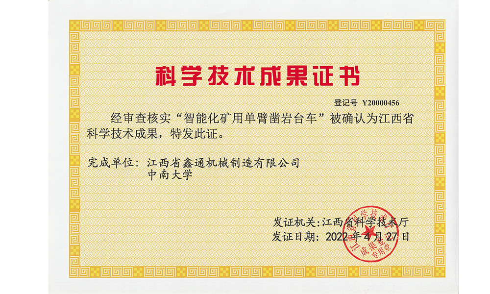 智能化矿用单臂凿岩台车荣誉证书